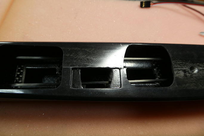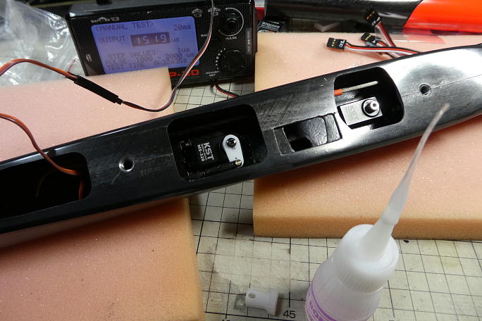胴体内部の接着面をサンドペーパーでサンディングして、足付けとします。 私が良く使っている裏側に糊の付いたロール タイプのサンドペーパー(スティキットリフィールロール)は指に貼り付いてくれるので、この様なシチュエーションにとても 便利です。 ![]() サーボベッドを位置決めをしっかりして、瞬間接着剤で接着します。 |