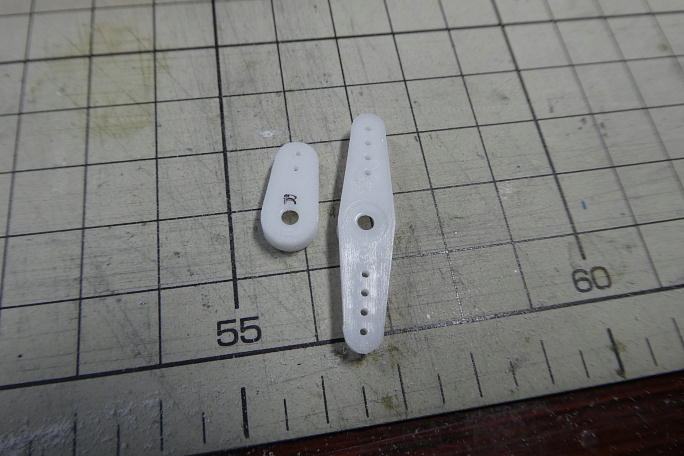 リンケージにはミニサイズの樹脂クレビスを使用します。 2ミリのリンケージロッドを通して、瞬間接着剤で接着する事に なるので、クレピス内部を2ミリのドリルで広げておきます。 スペースの関係でアジャスト機構は省略します。 ![]() この様に組み合わせます。 樹脂クレビスは瞬間接着剤が良く効きます。 ![]() サーボホーンを必要な部分を残してカットし、綺麗に成型しておきます。 ![]() クレビスとサーボホーンを組み合わせておきます。 ミニサイズのクレビスのピン径が1ミリで、サーボホーンと無加工で 入りました。 |