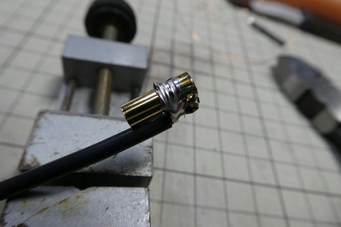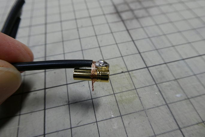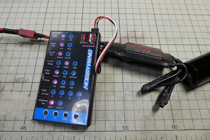 ESCの搭載スペースを稼ぐためにモーターとの接続コネクターを逆向きに取り付けます。 通常の工法なら、コネクターに 差し込む感じで固定してハンダ付けをしますが、この取り付け向きでは固定が難しいので0.4ミリの銅線で縛って仮固定 します。 ![]() ハンダ付け後、縛り目は切り落として、シュリンクチューブを破らないように整形しておきます。 ![]() コネクターにシュリンクチューブを掛けて養生しておきます。 ![]() サーボテスターを使って、動作確認とモーターの回転方向の確認をしておきます。 モーター側とESC側のシュリンク チューブに白マジックで合いマーク入れて、つなぎ直しの時に間違わないようにしておきました。 ![]() プログラムカードでESCの設定をます。 変更点はブレーキを有効にしますが、このESCではONかOFFしか選択肢 がありません。 他の物では、ブレーキの掛かり具合が選べる物もあり、今回のようにギヤダウンの場合はギヤへの 負荷軽減のため ソフト を選択します。 ![]() 逆向きに付けられたコネクターでこのようにモーターとESCがコンパクトにまとまります。 ![]() ![]() この機体ではESCのBECは使用せず、別に受信機用バッテリーを搭載するので、ESCのコネクタから+線を撤去します。 |