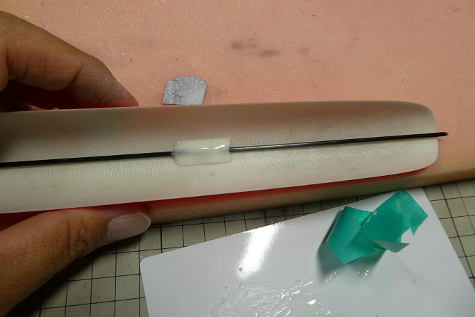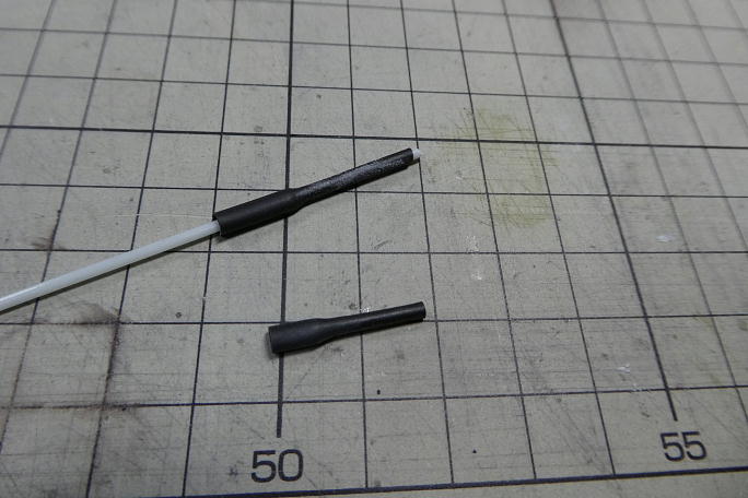 アンテナ線の取り出し口を作ります。 3ミリのシュリンクチューブを1.5ミリのグラスロッドを使って、内径1.5ミリの チューブを作ります。 ![]() アンテナは主翼後方から取り出します。 二本のアンテナが90°になるようにゲージを使って穴を開けます。 ![]() ![]() パイプを瞬間接着剤で接着しました。 アンテナをセットするとこの様になります。 |