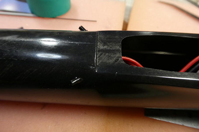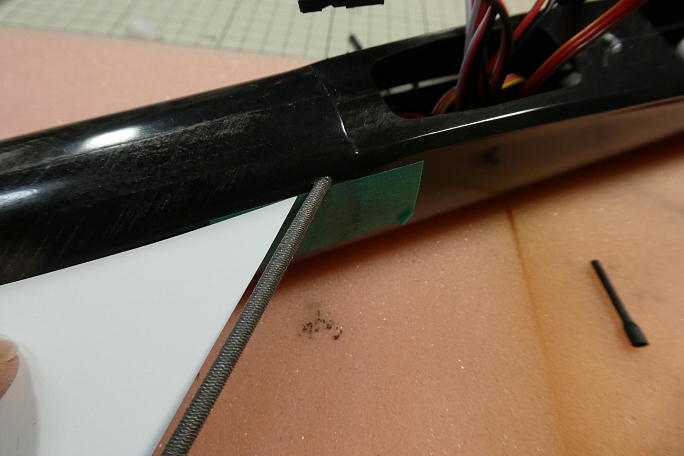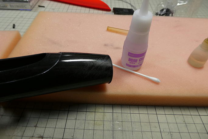 ![]() キャノピーラッチを取り付けます。 ラッチの2ミリのカーボンロッドを接着する部分のキャノピー裏をサンディングして足付けを しておきます。 ![]() 瞬間接着剤でカーボンロッドを仮接着してから、マイクロバルーン入り5分エポキシを盛って補強とします。 エポキシを盛る前に、マスキングテープで境界を作っておきます。 マスキングテープはエポキシが盛り終わったら直ぐに剥がします。 剥がしておくと、境界部分のエポキシが流れて自然な 感じになりますが、固まるまで放置すると、境界部分が段差になってしまいます。 ![]() 硬化した補強部分です。 |