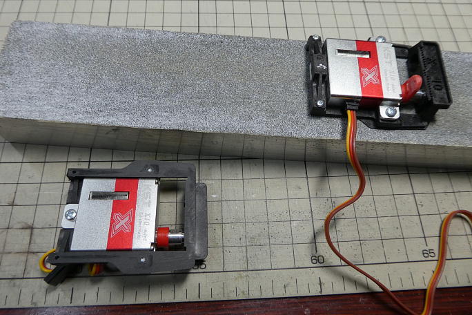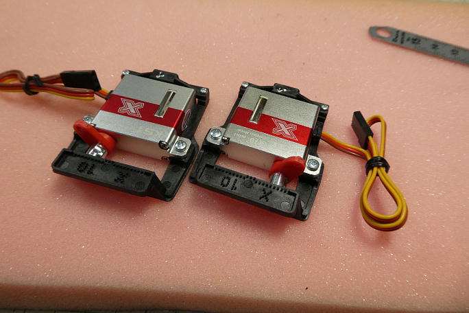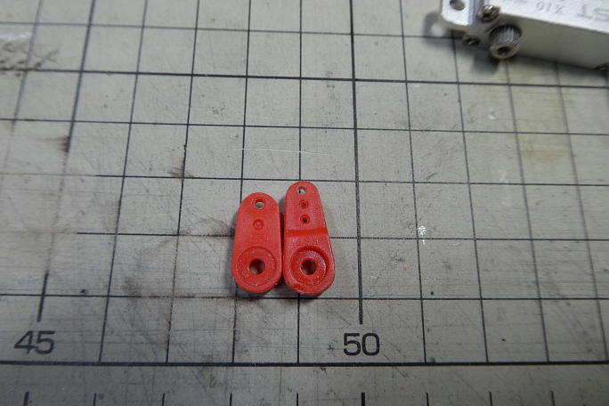 ![]() サーボロックにサーボを取り付けます。 付属の取り付けねじはポジドライブネジなので、ポジドライブのドライバーを 使用します。 ![]() サーボロックはKSTのX10とX10miniで共用なので、不要部分を切り取り、成型しておきます。 ![]() サーボホーンは舵角の関係で右の長いホーンを使用します。 このホーンはホーン部分が肉厚になっていて、クレビス に入らないので削って薄くする必要があります。 ![]() 150μs分オフセットした上で、更に1スプライン分ホーンをずらして取り付けます。 |