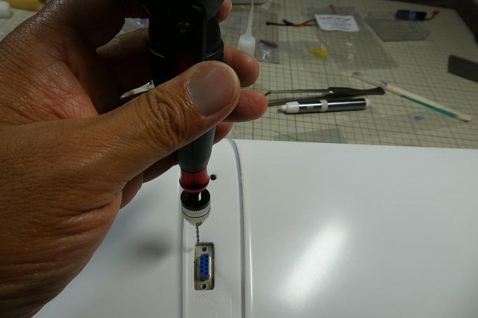 D−SUB9ピンコネクタを取り付けます。 1.5ミリのドリルで下穴を開けた所、片側の取り付け部の樹脂がほとんど 入っておらずスカスカでネジが全く効きませんでした。 ![]() 対処として、L字に曲げたアルミパイプを使って、取り付け部裏側に0.5ミリFRP板を接着しました。 取り付け部 裏側に0.5ミリFRP板をあてがって、先ほど開けたねじ穴から低粘度瞬間接着剤を流し、接着します。 ![]() 2.6ミリタッピングネジで無事に取り付けが出来ました。 |