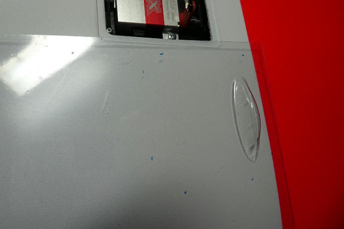付属のサーボカバーを使用します。 位置を決めて、カットラインをマーキングします。 判りにくいですが、青い サインペンで点を打っています。 ![]() ![]() 細く切った両面テープで取り付けました。 |