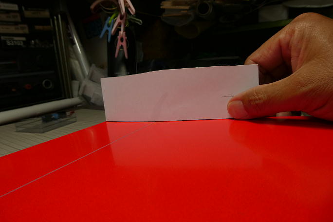 エルロンサーボ取り付け用に、フラップニュートラルでのセンター翼翼端の下面テンプレートを作成します。 Xplorer3は翼端までエルロンが切れていてニュートラルが判りにくいため、テンプレートでフラップとエルロンを合わせ ます。 |