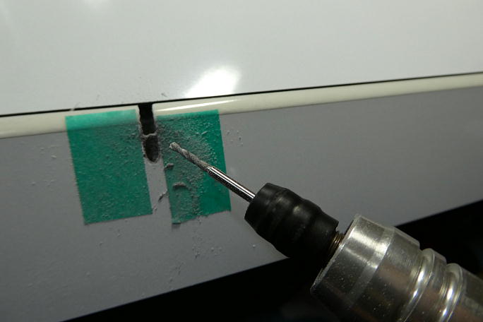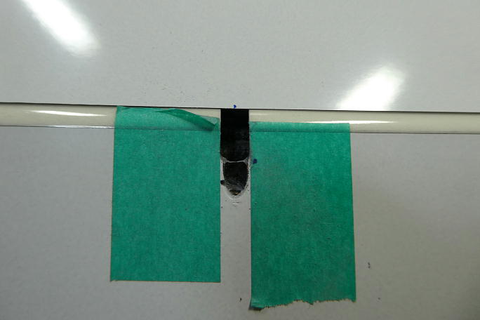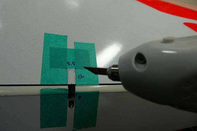 ![]() ロッド取り出し口のサイズを、こちらもフラップ同様に自分のF3J Xplorer3に合わせてマーキングします。 ![]() 表皮スキンを超音波カッターで切り開きます。 表面の歪の影響を与えないため、マーキングギリギリには刃を入れ ません。 ![]() マーキングでは切り欠き長を12ミリとしましたが、現物合わせで14ミリまで広げて決着しました。 |