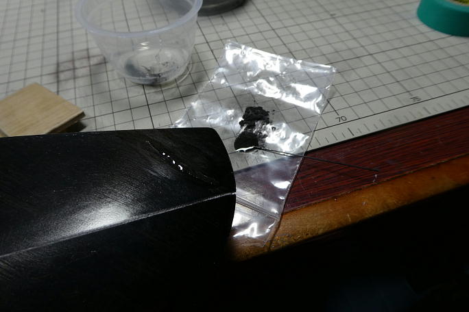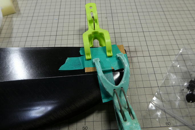 ![]() 梱包を解いたら水平尾翼に折れがありました。 感じからして、輸送中に...では無く、型から離型する際に力が掛かった 為の折れに見えました。 ![]() ![]() 見栄えも悪いので、この修理から始めます。 NANモデルの機体の尾翼回りのコアは、ロハセルでは無くスタイロフォームに カーボンを貼ったものです。 なのでコアの修理に瞬間接着剤が使えません。 エポキシ系を使うのがリスクが少ないので、エポキシを使った修理となります。 クラック部分を養生して、足付けと脱脂の為にサンディングをします。 ![]() 押さえにするのはベニヤ板にPPシートを両面テープで貼り、離型ワックスを塗った物です。 ![]() クラック部分にカーボパウダーを混ぜた5052を盛り上げます。 元々がカーボン地なので、カーボンパウダーの色で調色 も兼ねられます。 ![]() 押さえ板でサンドイッチして、洗濯ばさみで加圧します。 24時間後、押さえ板を剥がせば、クラック部分は概ね埋まっています。 |