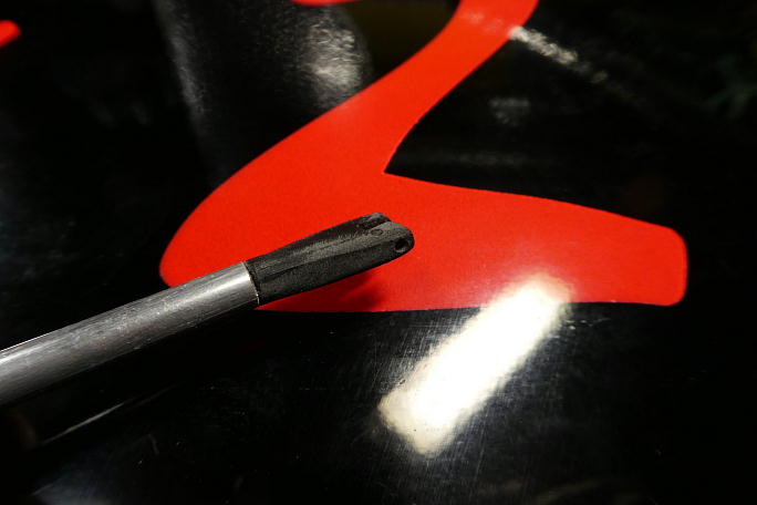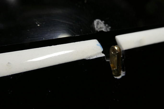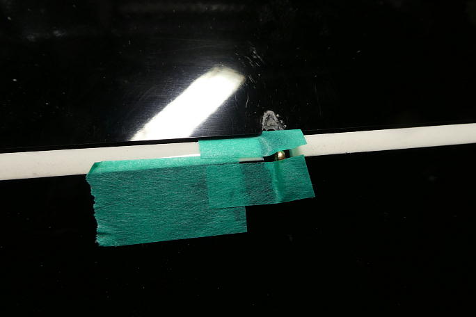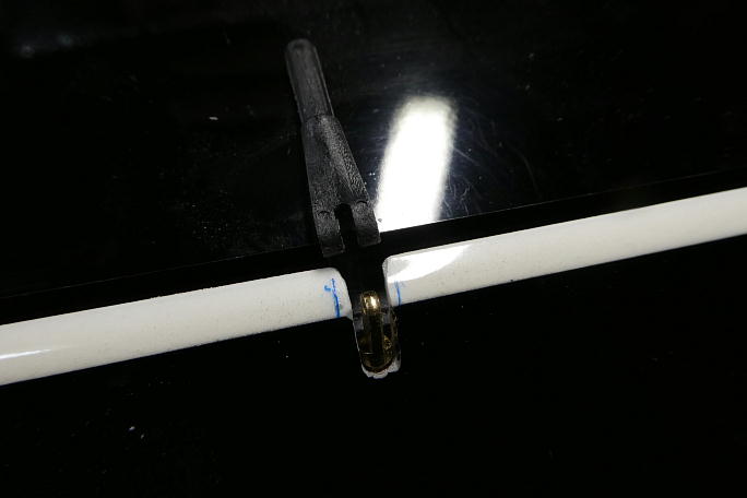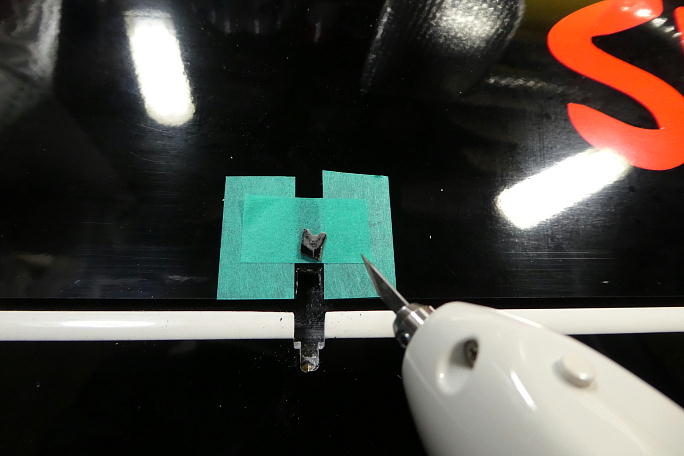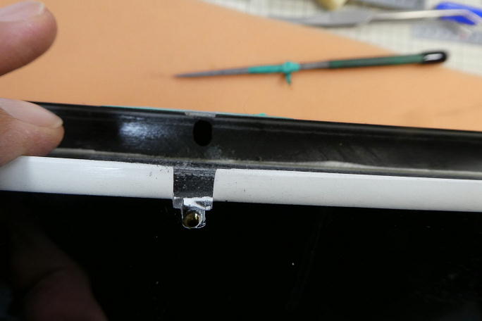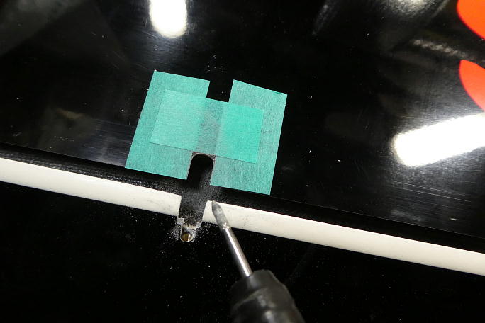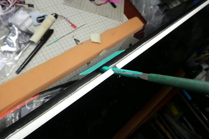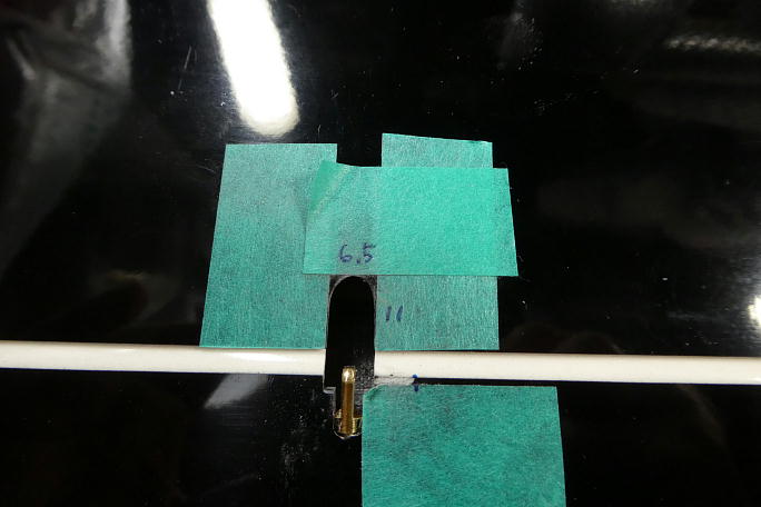 ![]() IDSのロッドエンドが入る様にギャップシールを削ります。 通常のロッドエンドの倍ほど幅があります。 ![]() ちょっと欲が出て、更にホーンを低くする事にしました。 そのままでは連結ピンが入れられないので、連結ピンを挿入 するための溝を作ります。 マスキングテープで養生をして、リューターで削りました。 ![]() この様な溝を作りました。 この溝にピンを滑らせて挿入します。 ![]() 後縁スパーに貫通穴を開けます。 丸ヤスリにマスキングテープを巻いて、ギャップシールを削らないようにします。 ![]() IDSのロッドエンドに合わせているので、穴も大きいです。 ![]() 状況が判らないので、とりあえず、小さめな穴を開けてみます。 超音波カッターでザックリと切り開きました。 ![]() 仮に開けた穴で動作確認をして見ましたが、案の定全く動作角が取れませんでした。 |