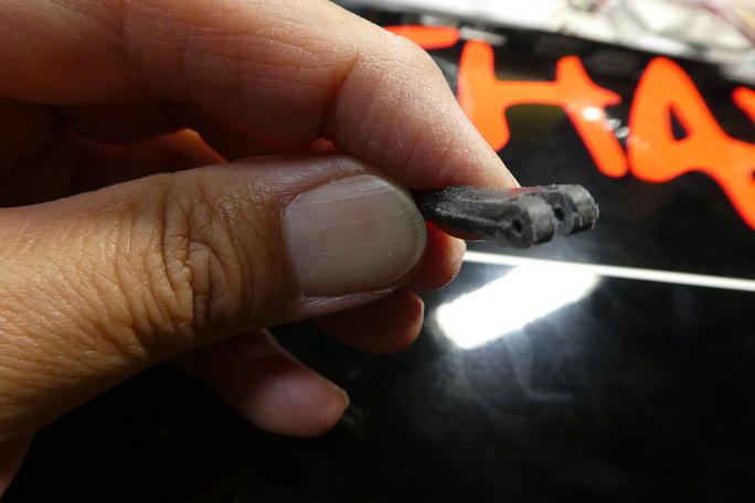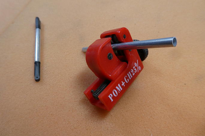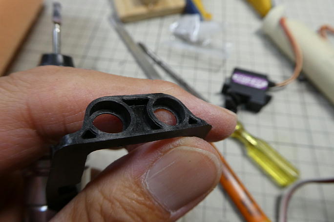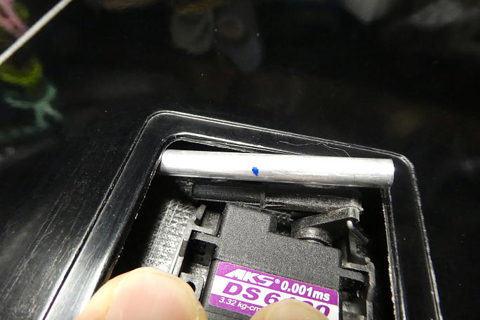 ![]() ![]() ブラスホーンにIDSホーン用のピンがスムーズに入る様にバリ取りをしておきます。 ![]() ![]() IDSロッドエンドのバリ取りを行い、ロッドエンドとサーボホーンがスムーズに組み付けられるようにロッドエンドを削って 調整します。 ![]() ロッドのアルミパイプをカットしますが、少し長めにカットして、動作を見ながら微調整を行います。 ![]() 仮ピンを入れて動作確認をしながら位置を決めます。 サーボの取り付けを考えて、出来るだけサーボホールの中央から スパー寄りにサーボを置きたい所です。 ![]() パイプのカットには小型のパイプカッターを使用しました。 |