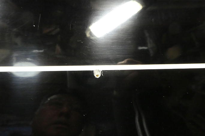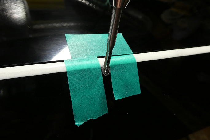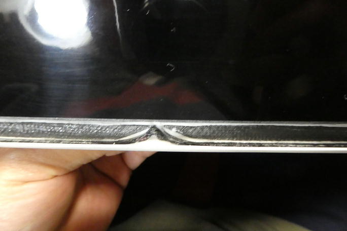 フラップの開口部を参考に、超音波カッターで表皮を切り取ります。 ![]() 14ミリ×6.5ミリの穴に整形しました。 |