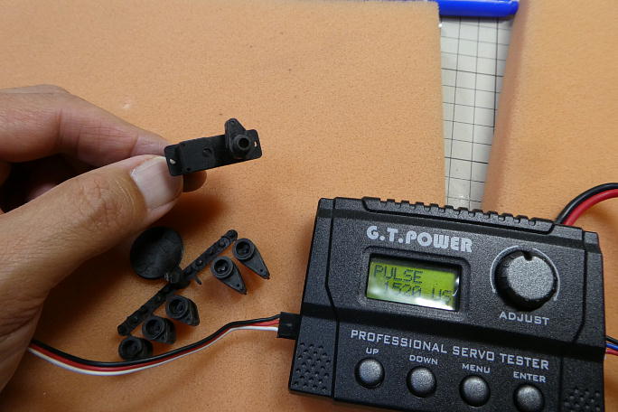 現物合わせでホーンの長さを測り、アルミパイプ部を42ミリでカットします。 ![]() サーボホーンは大きい方から3番目を使用し、ニュートラル1520μsとしてホーンを取り付けます。 |