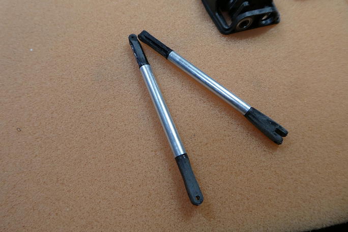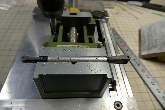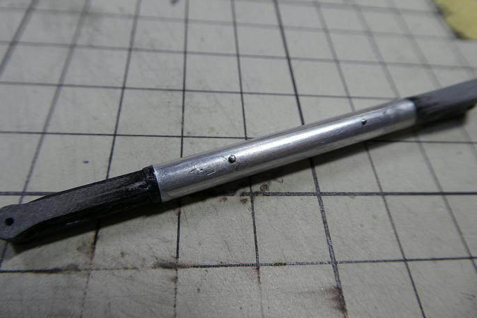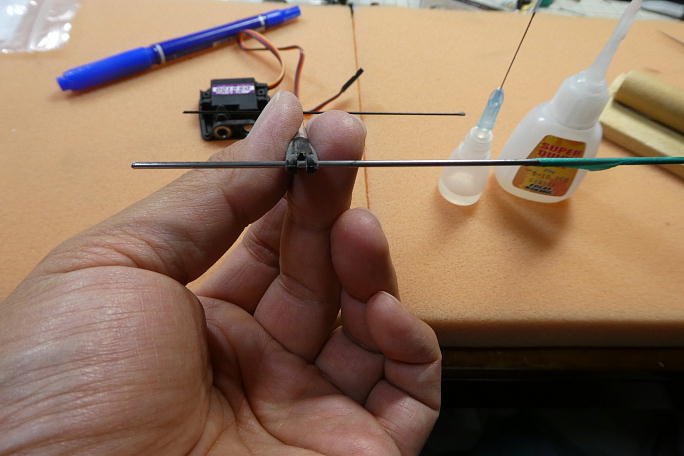 ![]() アルミパイプにロッドエンドを瞬間接着剤で接着します。 ロッドエンドのリンケージ穴にピアノ線を通し、サーボ側と動翼側の 穴位置を揃えます。 ![]() 接着の終わったリンケージロッドです。 ![]() こつらも抜け止め加工を施します。 ドリルで0.8ミリの貫通穴をロッドエンドとアルミパイプにあけます。 ![]() 0.8ミリピアノ線で作ったピンを用意しました。 ![]() アルミパイプにピンを押し込んで、低粘度瞬間接着剤を染みこませて接着します。 |
