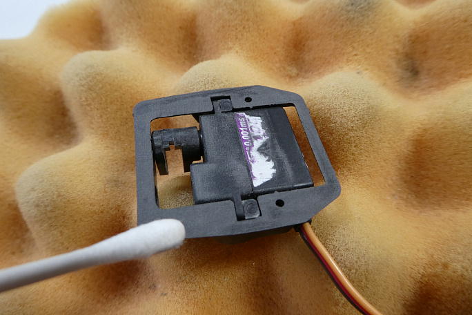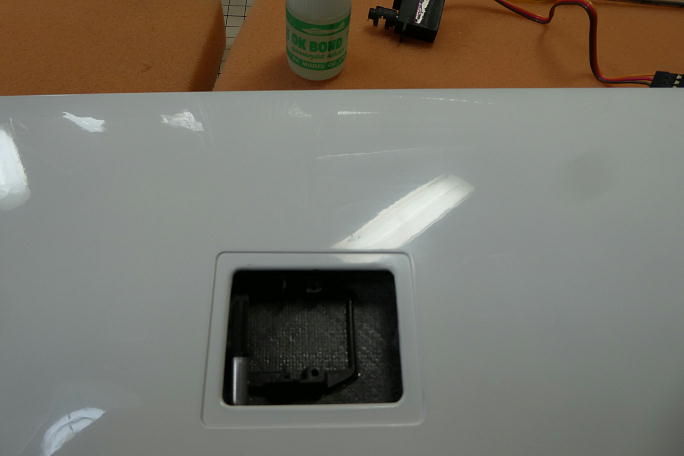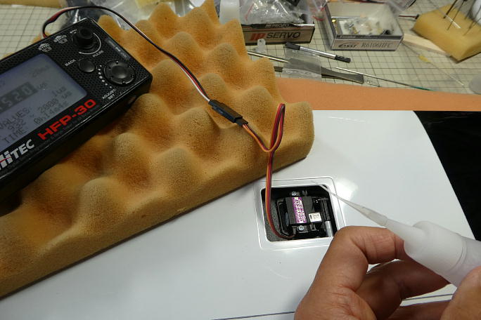 サーボホールの内部、サーボベースを接着する部分をサンディングして平滑にしておきます。 デコボコしている部分を 均して、接着面を確保します。 ![]() ![]() サーボホールの接着面とサーボベースの接着面を硬化促進剤で拭いておきます。 硬化促進剤は効果の持続時間が 長いロックタイトの712を使用します。 ![]() 動翼のニュートラルとサーボのニュートラル1520μsを合わせて、サーボベースの四隅のみに瞬間接着剤を一滴ずつ だけ垂らして仮接着します。 瞬間接着剤を垂らしたら直ぐに硬化促進剤で接着剤を硬化させます。 この時の硬化促進剤は白化の少ないボブスミスの硬化促進剤を使用します。 主翼表皮の歪み防止です。 ![]() 一度サーボを取り外して、サーボベースの全周に中粘度瞬間接着剤を流し、直ぐにボブスミスの硬化促進剤で硬化させます。 ![]() サーボとリンケージを取り付けてエルロンリンケージは完了です。 |