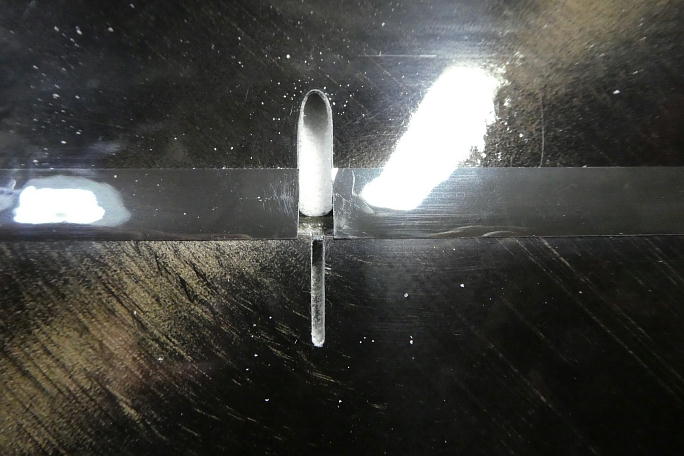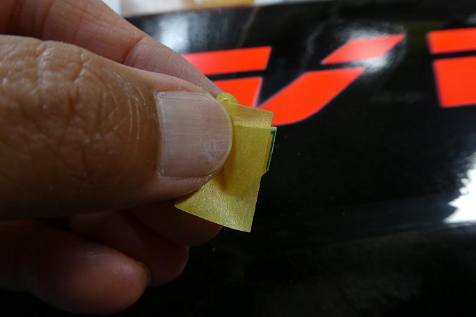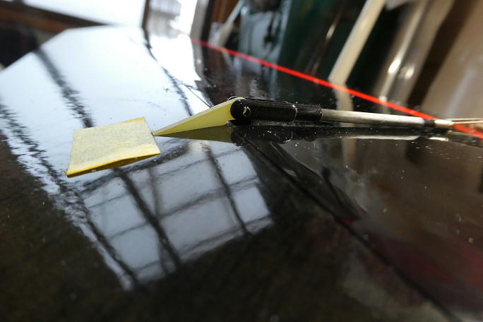 ![]() サーボホールはコアが削り取られていますが、サーボホール底部から下面スキンまで15ミリの深さです。 この深さではサーボホーンが下面から出ないようにしようとすると、一番中心に近い穴しか使えません。 まだ底部のコアの厚みがたっぷりあるので削って深くすることにします。 ![]() 平らに削れるようにサンドペーパーを貼った色々なツールを作り、サーボホールの底を削り込みます。 上面スキンの カーボンが透ける位、役0.5ミリ程度までコアを削り込みます。 ![]() 約3ミリ削って、下面スキンまで18ミリになりました。 中心から二つ目のサーボホーンが使えるようになりました。 |