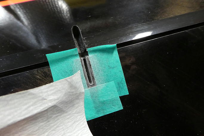 ![]() フラップホーンの接着面をサンディングして足付けをします。 アルコールで脱脂もしておきます。 ![]() フラップホーンのスロットを2ミリ開けてマスキングし、スロット周囲をサンディングします。 ![]() マスキングの幅を1ミリ程に狭めて、カーボンパウダー入り5分エポキシをスロットに充填します。 ![]() 不ラツプホーンをスロットに沈めて、はみ出た接着剤を除去、平滑に均したら硬化が始まる前にマスキングを剥がして おきます。 |