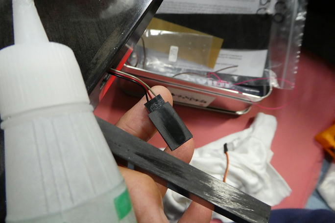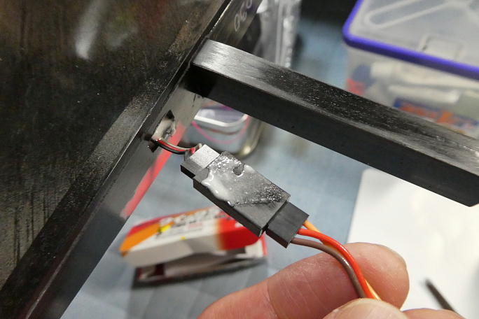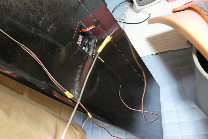 ![]() 胴体との接続コネクターはMPXコネクターを使用します。 片翼あたり4線のコードを自作しました。 3線のサーボコードに、もう一本瞬間接着剤で貼り付けて4線にします。 +と−はフラップ、エルロン共用です。 ![]() コードを主翼内に通します。 コア翼なのでコードホールが開いていますが、サイズはコード分+アルファ程度しか無く、 コネクタハウジングが通るサイズではありません。 いままで、サーボコードを通す時に重りを付けた道糸を使っていましたが、今回から糸ハンダを使用しています。 融点か高くて使いにくい「鉛フリー」ハンダが良い感じです。 ![]() コネクタハウジングが通らないので、フラップサーボのメスコネクタのハンダ付けは主翼の上で行う事になります。 ホール紙で養生をして、ハンダ付けを行います。 |