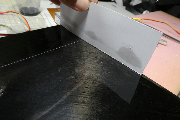 ![]() この機体の外翼は翼端までエルロンが切れているタイプで、ニュートラルが判りにくいので、中央翼の翼端でニュートラル のテンプレートを作り、ニュートラル出しに使用します。 |