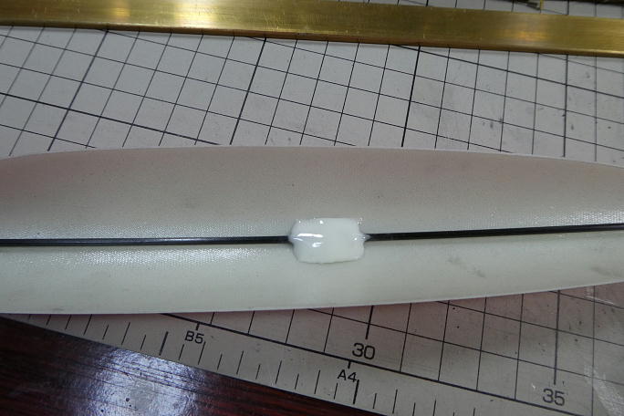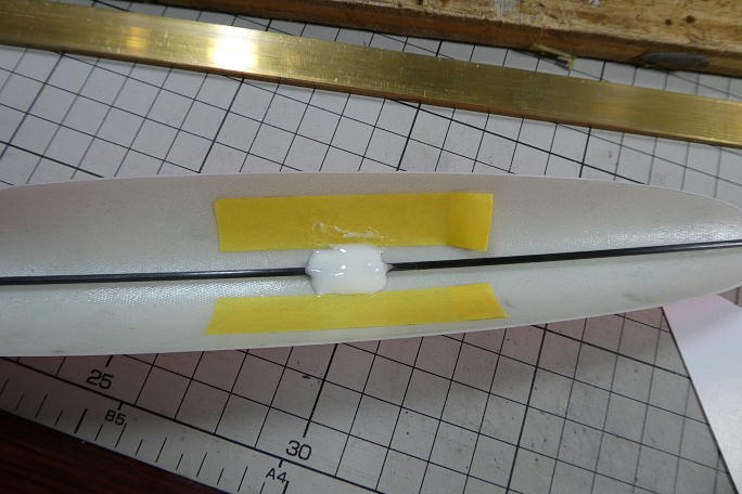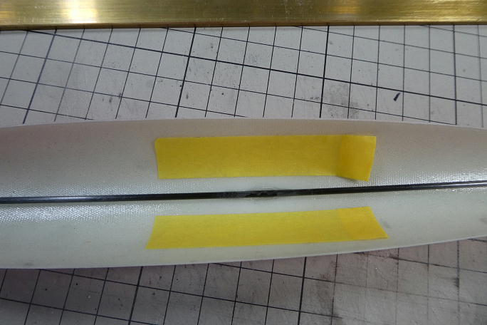 ![]() キャノピーラッチは2ミリのカーボンロッドです。 先ずは瞬間接着剤で仮接着をします。 ![]() マスキングテープで予め充填する幅を決めてから、マイクロバルーン入り5分エポキシを盛ります。 ![]() 5分エポキシを盛り終わった後直ぐにマスキングテープを剥がすと不自然にならずに決まった幅で仕上げる事が出来ます。 |