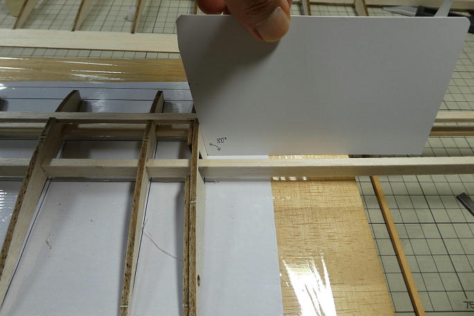 ![]() カンザシから上反角ゲージを作ります。 ![]() 中央リブのサブスパーが当たる部分を上反角分削っておきます。 そのままですと、この部分でサブスパーが脹らんで しまうためです。 ![]() 上反角ゲージに合わせて、センターリブを接着します。 センターリブはこの時点ではサブスパーと後縁材にしか接着 されていないので、ハンドリング時には注意が必要です。 |