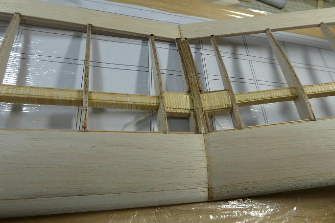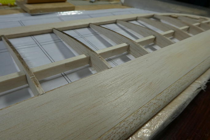 ![]() リブが削れてしまわないようにマスキングテープで養生をして、上面プランクとリブとの段差をプランク材を削って 調整します。 ![]() 調整済みのプランクとリブの繋ぎ目部分です。 メインスパーの端材にサンドペーパーを貼って、リブ下面から飛び出したスパー材を削ります。 リブとツライチになるように削ります。 |