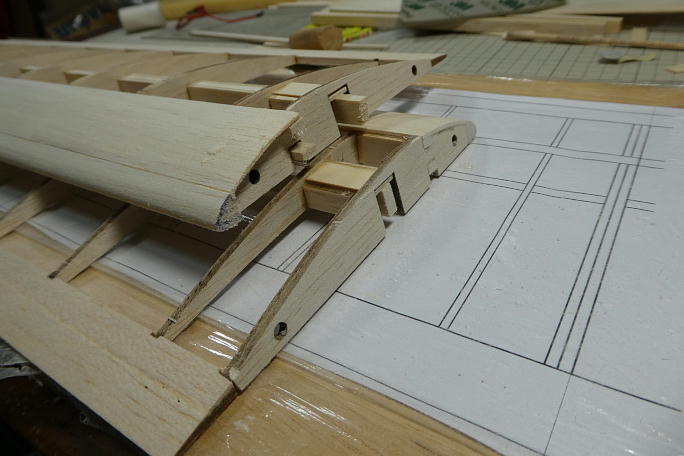 ![]() センターリブの端面を整えます。 上が削る前、下が削った後です。 ![]() 後縁材とセンターリブに出来てしまった段差をスクラップバルサで埋めます。 ![]() 埋めたスクラップバルサを削って仕上げます。 |