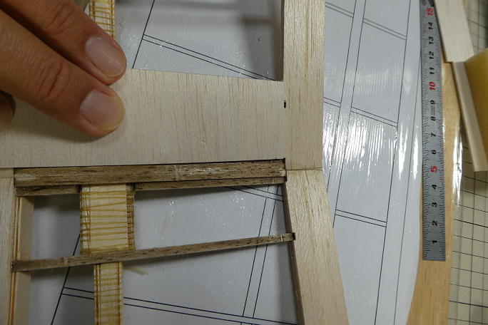 ![]() ゴム掛けの補強は1.5ミリベニヤです。 前縁部分に段差があると、フイルムを馴染ませるのに苦労するので、極力 薄く削っておきます。 ![]() 裏側にノコ目を入れて、分割せずに接着しました。 ![]() 主翼の生地完成です。 |