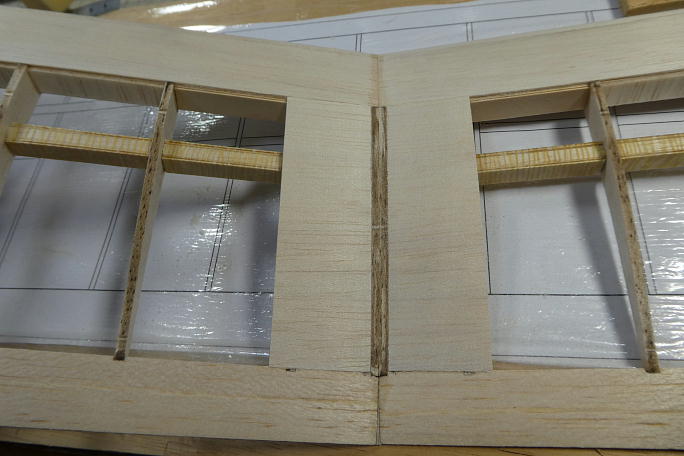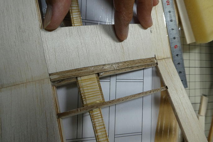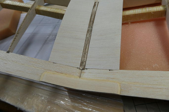 ![]() 上面のセンタープランク材です。 上反角の分センターリブが傾いているので、そのままではセンターリブにプランク材 が沿いません。 ![]() 角度合わせをして調整してぴったり合うようになりました。 ![]() 左右のプランク材を接着、サンディングして平滑にしておきます。 |