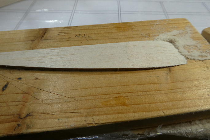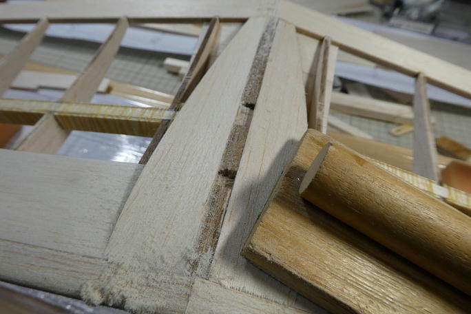![]() 下面の中央プランクはアンダーキャンバーの分削って調整してからの接着になります。 ![]() カッターで荒削りをした後、サンディングブロックで仕上げます。 ![]() センターリブに謎の切り欠きがあるので、3ミリのスクラップバルサで埋めておきます。 この部分は胴体とのコンタクト 部分なので、少しでもしっかりとさせておきてい所です。 ![]() ![]() 中央プランクを接着、サンディングして平らにしておきます。 センターリブとアンダーキャンバーの段差にスロープを接着してます。 前作では、スロープが短くてフイルムを 沿わせるのに苦労したので、2枚目のリブまで延長しました。 |