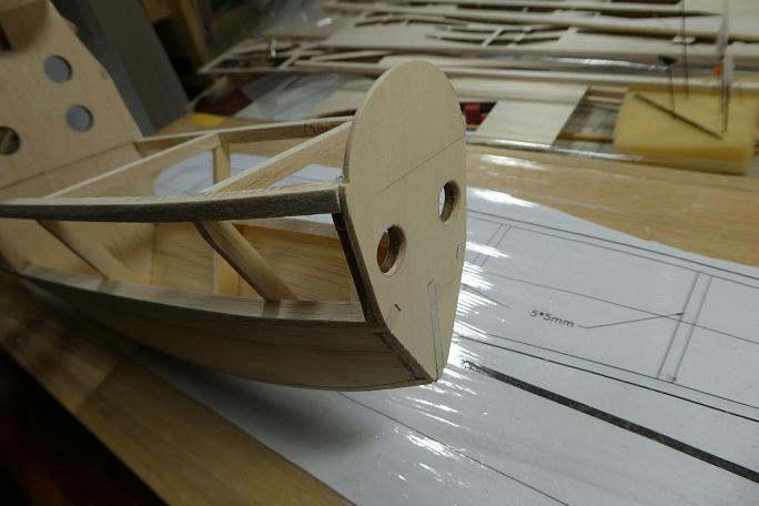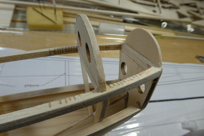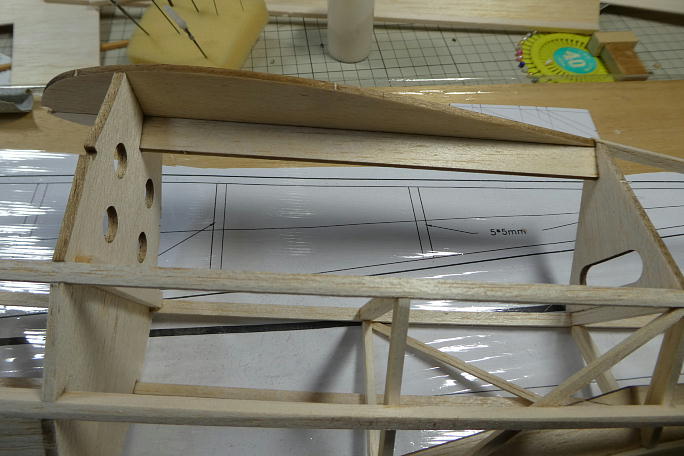 ![]() 主翼の乗る天板の合わせ目部分に上反角分の角度を付けておきます。 ![]() 天板を接着しました。 予め角度付けをしておいたので、ピッタリと合わせ目が整っています。 ![]() 下面側もピッタリと合っています。 この部分で胴体の重さを全て支えるので、接着不良は出したくないところです。 ![]() 本来は、ストリンガーとフイルムのテンションだけで持たせる仕様なのですが、6*4ミリバルサで柱を一本追加して います。 |