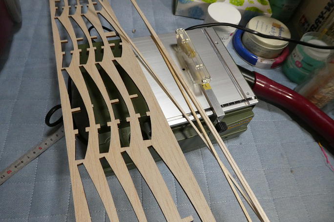 ![]() ストリンガーと上半身のトラス用の3*3ミリバルサが底を突いたので、スクラップバルサから追加生産します。 この手の機体を作るときはテーブルソーがとても役に立ちます。 ![]() ![]() 上半身のストリンガーとトラスが入れ終わりました。 かなり複雑な造形になっています。 暫く眺めていました。 |