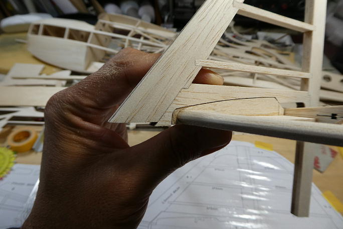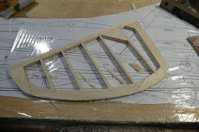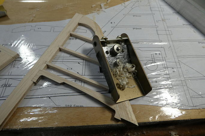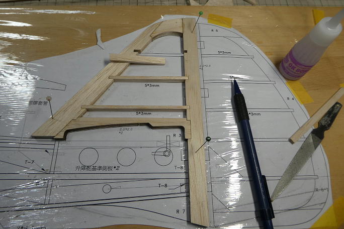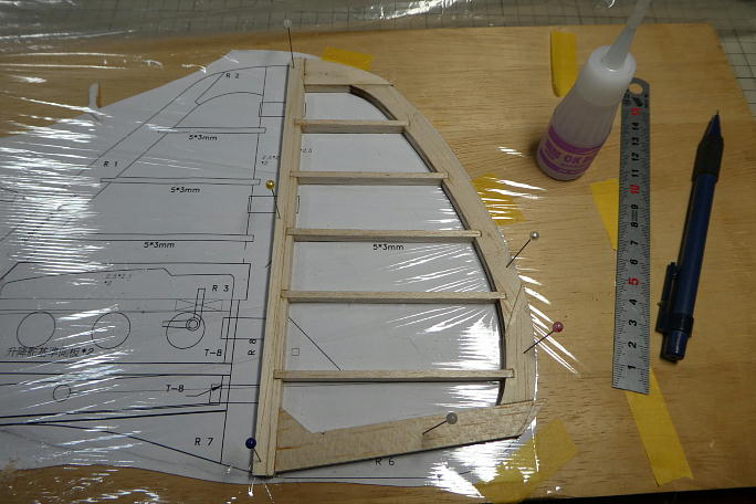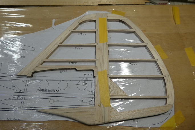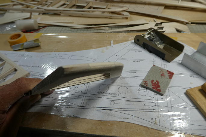 追加生産した部材を使ってラダーを組み立てます。 前作では図面のラダーの形状が地面を擦る形状のまま作りましたが、 今回は地面から逃げるように形状を変更します。 ![]() ざっと全体をサンディングして形を見ます。 ![]() ![]() 後縁を1ミリ以上残す様に全体をサンディングします。 真ん中が減ってしまいがちなので、力の入れ具合に注意します。 ![]() 垂直尾翼部分もスロットを部材に合わせて広げておきます。 ![]() 図面上で組み立てていきます。 ![]() ![]() 前縁をバルサカンナで削り、続いて全体を前縁から繋がるようなラインで成型していきます。 ![]() ラダーと並べて全体のバランスを見てみます。 ![]() 水平尾翼との接合部分の形状がおかしいので、水平尾翼側にスクラップバルサを接着し成型、形状を水平尾翼に合わせます。 ![]() 木目が違う所が追加成型した部分です。 ![]() フィンを成型して図面に乗せてみました。 これなら着陸時に地面を擦らずに済みそうです。 |