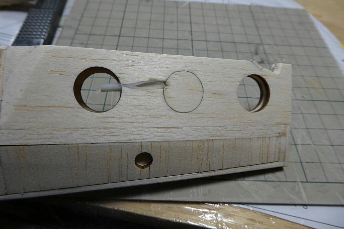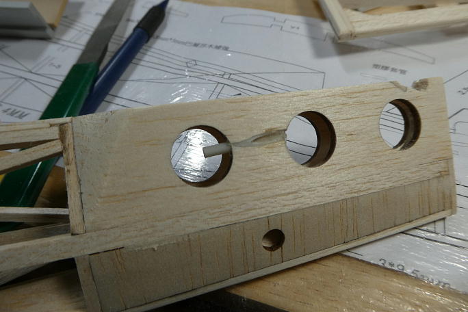 ![]() ゴム掛けダウエルの受けには1.5ミリベニヤから切り出したパーツを接着します。 ![]() この位置に接着します。 図面ではストリンガーの下に接着することになっています。 |