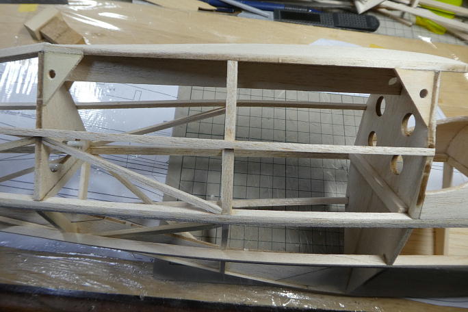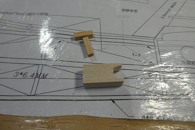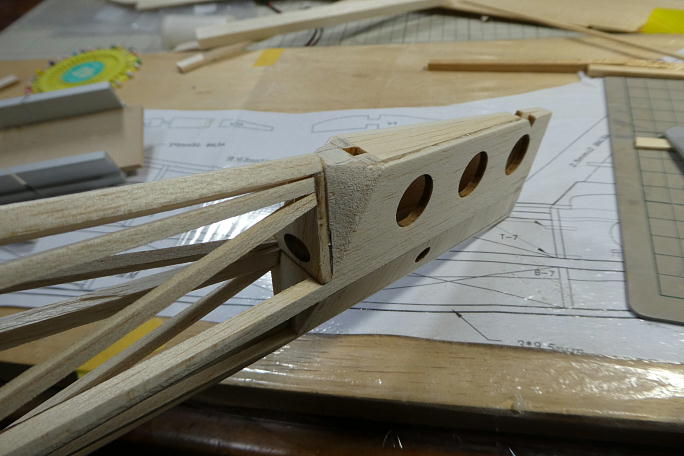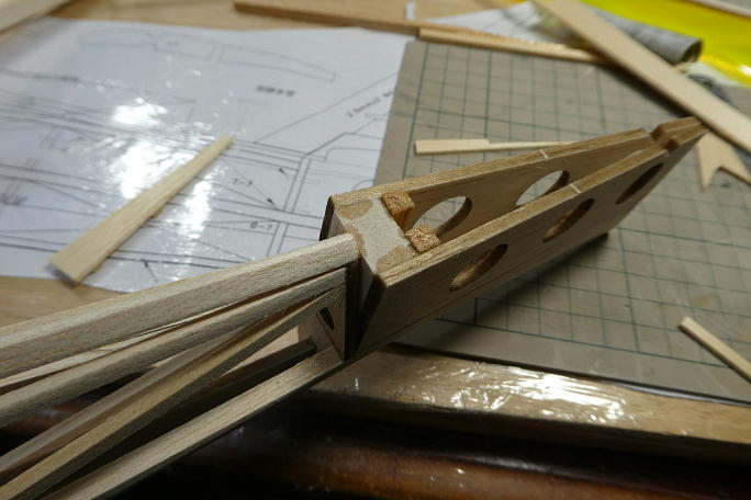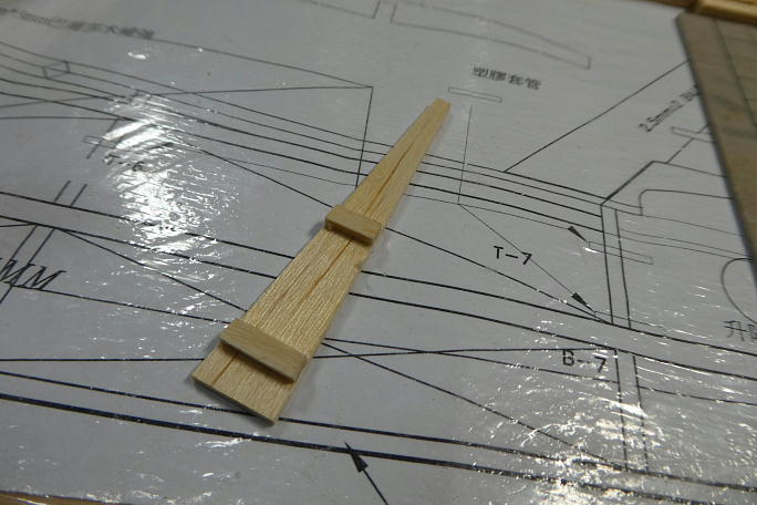 二次元の図面では判別が困難な水平尾翼マウント部分。 バルサブロックと5*5バルサ角材で補完します。 前作では 加減を見ながら隙間を埋めた感じになりましたので、今回は最初からブロック材としました。 ![]() 水平尾翼マウント部分を補助部材とで接着した所です。 図面を直訳すると、穴の開いた左右の部材は上部で合わせる ように接着する事になり、水平尾翼の乗る面積が圧倒的に不足します。 ![]() 蓋は2ミリバルサに桁を接着した物を用意しました。 ![]() 蓋を接着、ざっと整形しました。 |