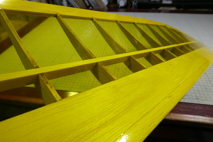 ![]() 主翼下面から貼っていきます。 きむらクラフトではフイルムは実際の大きさでカットし、弛まないように外周を低温の アイロンで押さえて借り固定してから、全体を滑らせずに押さえる様に低温のアイロン貼っていきます。 その後、リブ間やシワの寄った部分を高温のアイロンで修正していきます。 ![]() 下面が貼れたら上面のフイルムを貼ります。 手順は下面同様です。 翼端の処理用に高温のアイロンも用意して、アイロン2台体制です。 ![]() 前縁はホワイトのAフイルムでツートンカラーにしました。 ナセル部分は無理せずに二分割で貼りました。 ![]() 中央の合わせ目部分は型紙を作って切り出したAフイルムを使用しました。 ![]() 主翼が貼り終わりです。 |