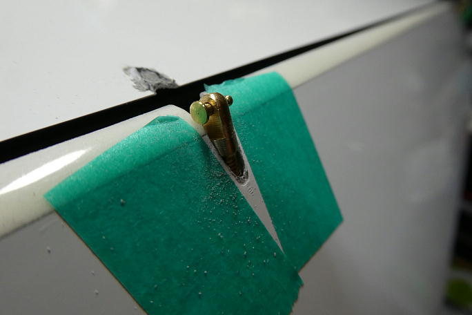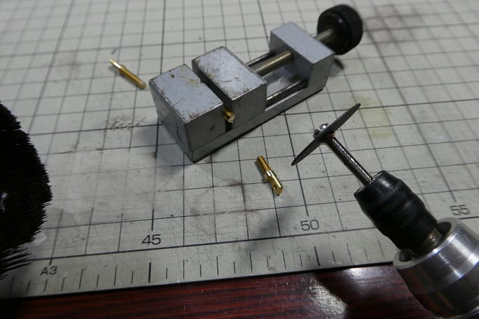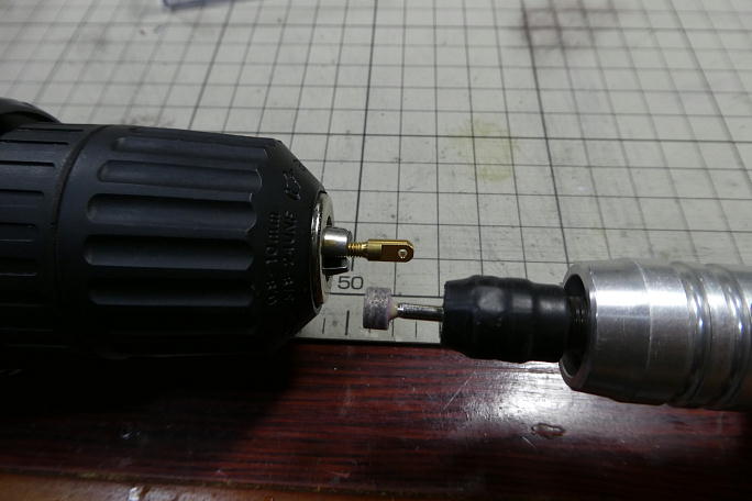 ![]() 右の三本のブラスホーンはキット付属の物ですが、長さも形状もバラバラです。 フラップはブレーキ舵角を確保するためにホーンの背を低く抑えたいので、一番左のMP−JETのブラスホーンを使用 します。 右の二本はエルロンに使用します。 ![]() 足の長さがバラバラなので、リューターの丸砥石でカットして揃えます。 ![]() いつも首の部分を動翼に納めるのに苦労するので、首の部分を削っておきます。 ![]() 電動ドリルにブラスホーンを咥えて、回しながら削ります。 |
