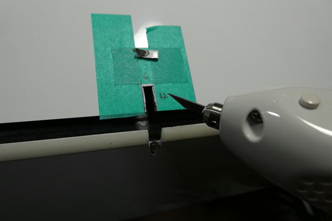 ![]() ![]() ロッドエンドの取り出し口は、今まで製作した機体の最小のサイズで切り開いておきます。 後は実際にサーボ、ロッド を組み込んでからサイズを調整します。 ![]() 成型が終わったロッドエンドの取り出し口です。 樹脂クレビスのピンの逃げも加工します。 |
