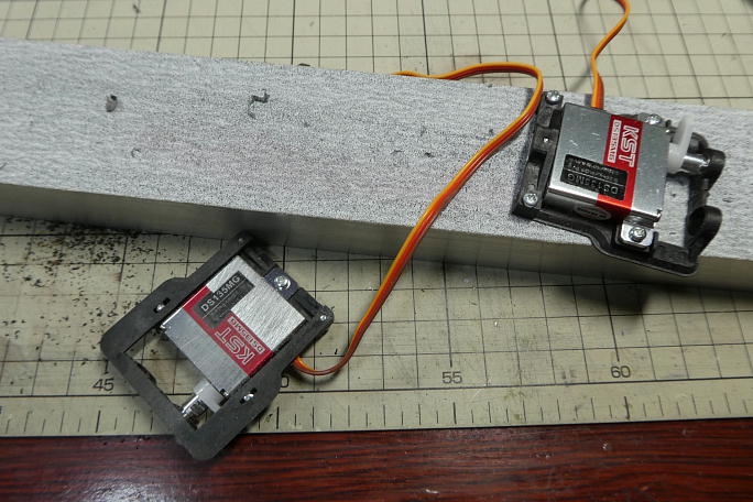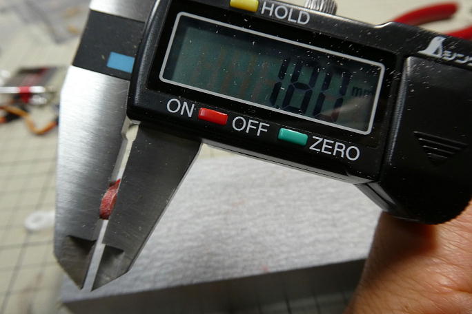 ![]() サーボロックはバリだらけなので、不要部分は削り落としておく。 ![]() 2機同時製作ですが供給サーボは二種類あって、1機はKST X10mini、もう1機はKST DS135MGです。 付属のサーボホーンが違います。 左の赤いホーンが X10mini、右の白い物がDS135MG付属のホーンです。 フラップで使用する穴はこのホーンの一番 中心に近い物で、不要部分を切り取って整形しておきます。 ![]() X10min用のサーボホーンは厚みが2.5ミリあって、そのままではクレビスに収まりません。 ![]() DS135MG付属のホーンが厚み1.8ミリなので、赤いホーンを削って厚みを合わせます。 サーボホーンはニュートラルの状態で1スプライン分ずらして取り付けます。 |