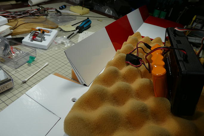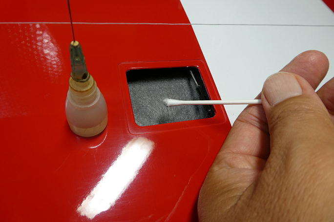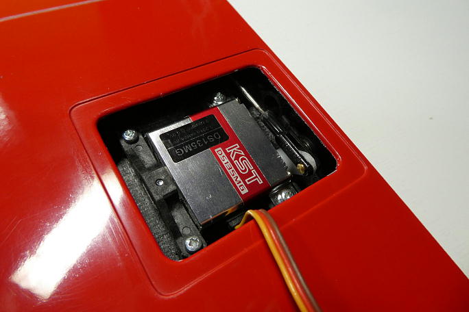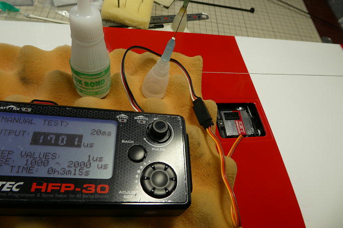 ![]() 仮組をした状態で、サーボの動作確認をします。 フラップサーボはバタフライ時の舵角が確実に取れているかを チェックします。 ![]() サーボホールのサーボベッド接着部分を良くサンディングしてして、平滑にしておきます。 この部分は型などが 当たっていないので、デコボコの上ザラザラです。 ![]() サンディングしたサーボホールを硬化促進剤を染みこませた綿棒で拭いておきます。 清掃と接着を確実にする ためです。 サーボベッドの接着面も同様に硬化促進剤で拭いておきます。 この時に使用する硬化促進剤はロックタイトの712です。 ![]() サーボのニュートラルを1700μsとして、フラップのニュートラルを合わせ、サーボベッドの四隅のみ一滴の 中粘度瞬間接着剤で接着します。 瞬間接着剤を垂らして染み込みを確認したら、直ぐに硬化促進剤を垂らして 硬化させます。 この時に使用するのはボブスミスの硬化促進剤です。 ![]() 仮接着が済んだら、サーボを一度取り外し、サーボベッドの全周に中粘度瞬間接着剤を流し、直ぐに硬化促進剤で 硬化させます。 使用するのはボブスミスの硬化促進剤です。 ![]() 再度サーボを取り付けて完了です。 ![]() 動作の最終確認をしておきます。 |