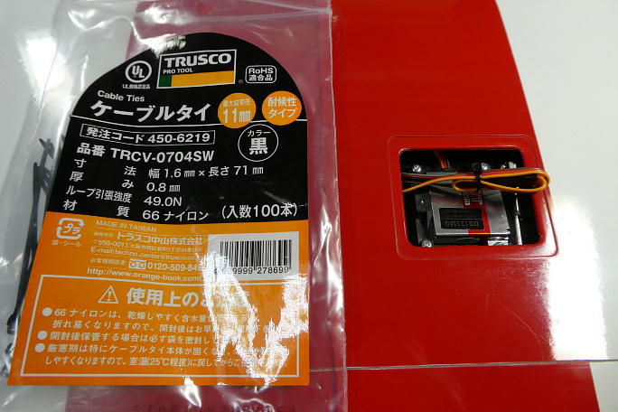 余ったケーブルは、引っ張っても直にコネクタが引かれて抜けないように束ねて、極細タイラップで結束して整理します。 |