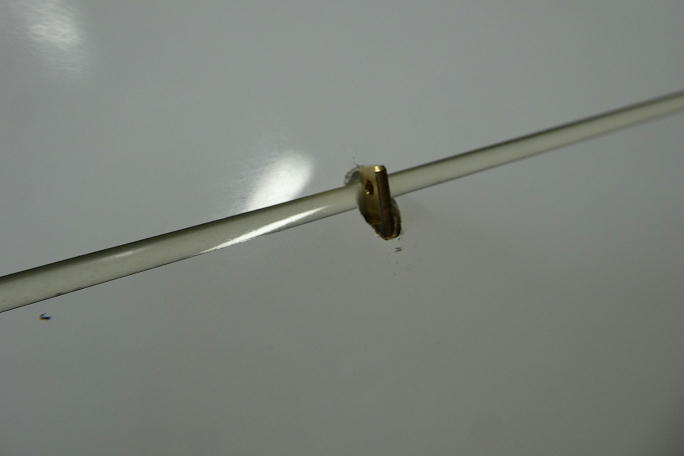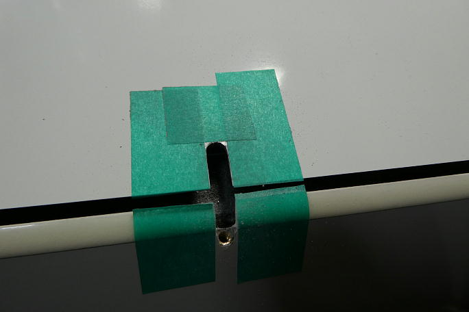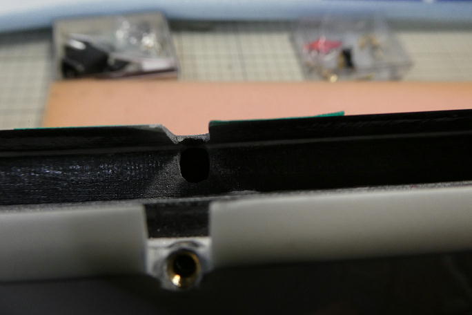 ![]() エルロンホーンの加工前の状態です。 ![]() 例によって、エルロンホーンの埋め込みナットをM3のタップでさらっておきます。 離型ワックスやら、回り込んだ樹脂 やらが沢山出て来ます。 ブラスホーンをねじ込んで、ホーンの首までねじ込むことが出来るか確認しておきます。 エルロンには、機体に付属 する長い方のブラスホーンを使用します。 ![]() 仮に幅6ミリ、長さ12ミリでロッド取り出し口を加工します。 後に実際にサーボとロッドを組み込んだ段階でサイズは 調整する必要があります。 ![]() ![]() 超音波カッターで表皮部分を切り取った後、リューターにて仕上げます。 ![]() ロッドの貫通穴を加工します。 通常、アップ側のクリアランスが厳しくなるので、クレビスの逃げを削り込んであります。 |