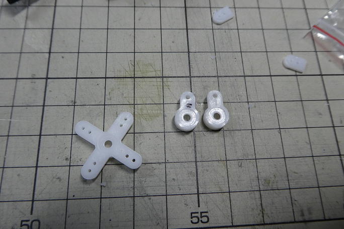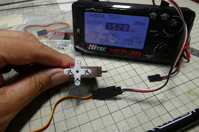 ![]() フタバ用に1520μsでニュートラルを出し、サーボと直角になるホーン位置を選びます。 ![]() 不要部分をカットして成型しておきます。 ![]() 主翼下面からサーボカバーの飛び出しが無いように、短いホーンを使いますが、フル舵角の際にクレビスとホーンとの 干渉がおきます。 その為にホーンにクレビスが当たる所を削って干渉を防止します。 |