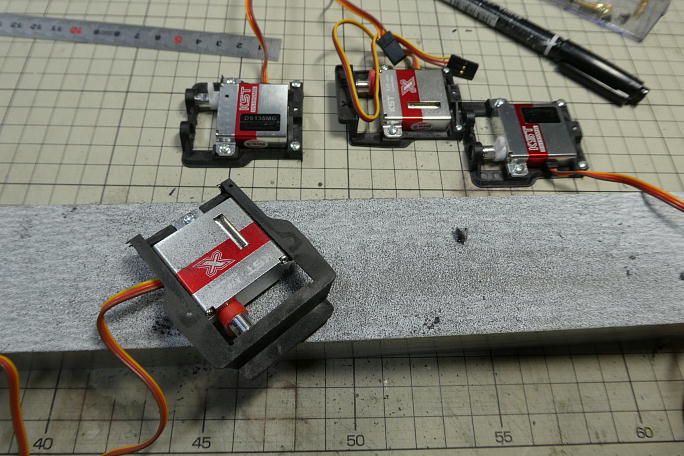 ![]() サーボベッドにベアリングを入れますが、手で入る硬さでは無かったので、ミニバイスを使って圧入しました。 ![]() サーボベッドにサーボを組み付け、不要部分を切り落とします。 KSTのX10miniとX10の両方に対応するように サーボベッドが出来ているのでminiを使用した場合、後ろの取り付け部が一つ余るのです。 ![]() サーボベッドの接着部をサンディングボードで研磨して平滑にしておきます。 樹脂成形時のヒケを取って、接着を確実 にするためです。 |