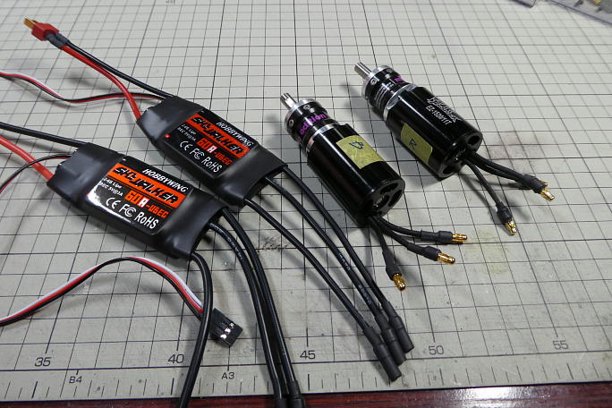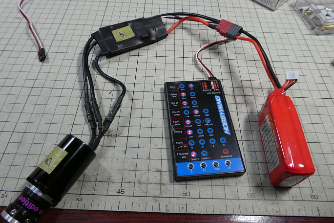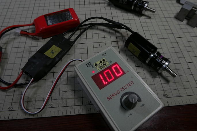 ![]() アンプにコネクターをハンダ付けします。 コネクターは定番のディーンズです。 最近のF5JシーンではXTタイプの コネクターがほとんどです。 ディーンズコネクターと違って、抜き差しの固さにバラツキがありません。 ただ、XT60となると、ディーンズよりも大きくなってしまいます。 きむらクラフト所有機では短時間の使用を前提に コンパクトなXT30を使用しています。 ![]() 二機分のアンプとモーターにコネクタの取り付けが完了しました。 ![]() ![]() サーボテスターでモーターを極低速で回転させて、回転方向を確認しておきます。 回転しているシャフトを「ツルン」 と撫でて回転方向を確認しています。 回転方向が確認出来たら、モーターとアンプのコネクタにアイマークを入れておきます。 ![]() セッティングボードを使ってアンプにブレーキを設定しておきます。 大抵のアンプがプレーンをメインユーザーとして いるようで、購入してからのブレーキ設定は必須のようです。 |
