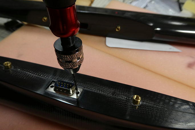 ![]() D−SUB9ピンコネクターを取り付けます。 位置を合わせて、2ミリのドリルで下穴を開けます。 ![]() 2.6ミリの皿タッピングねじで固定します。 |