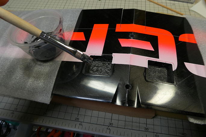 ![]() 5052にカーボパウダーを混ぜた物を作ります。 カーボンパウダーの量は筆で塗れる程度の粘度に留めておきます。 ![]() サーボホール内に薄く塗りつけます。 サーボが接着される上面スキンとコアの境目は重点的に塗り込みます。 側面も同様に塗り、固めます。 ![]() コアが剥き出しになってしまうエルロンリンケージ穴にも塗っておきます。 |