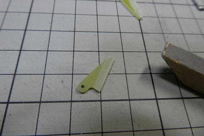 サーボホーンは中心から4.5ミリの穴を使用します。 不要部分をカットして成型しておきます。 ![]() サーボホーンのリンケージ穴は0.8ミリ基準で開けられているので、今回使用する1ミリロッドに合わせて1ミリドリルで 広げておきます。 |