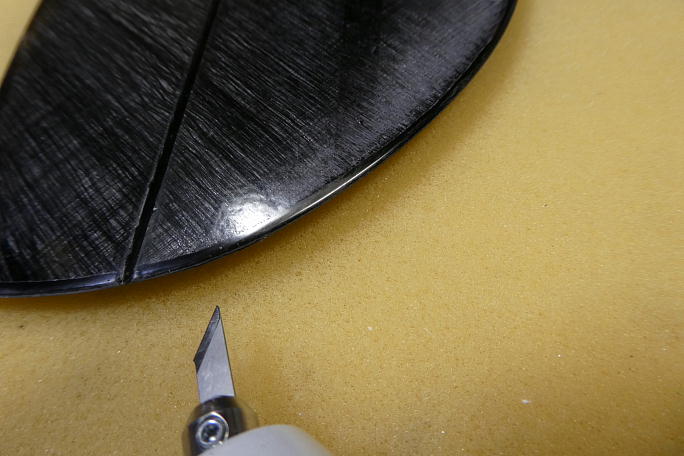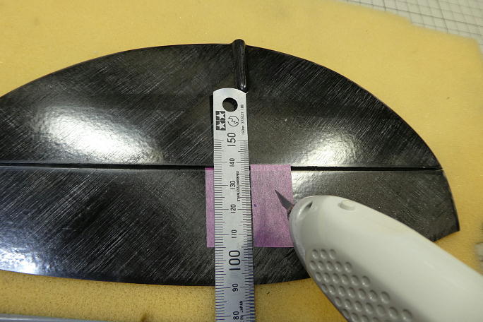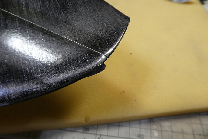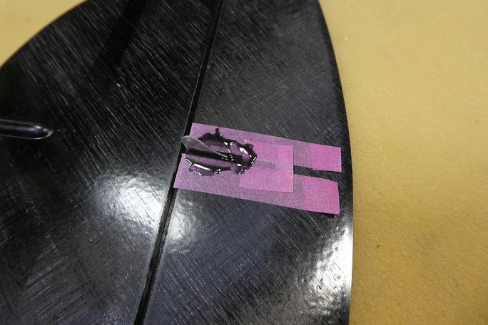 ![]() 垂直尾翼下部にスキッドを取り付けます。 堅い所に下ろしてしまったり、駐機させるときに役に立ちます。 超音波カッターで垂直尾翼底部のパーティションラインに沿って切れ込みを入れます。 PROGRESSではこの周囲はマイクロバルーン入りエポキシが充填してあってハードポイントとなっていましたが、この機体 ではロービングは有る物の、直ぐにロハセルが顔を出しました。 ![]() カーボンシートを押し込みますが、垂直尾翼の接着する周囲とカーボンシートの表面をサンディングしておきます。 ![]() カーボンパウダー入り5分エポキシを切れ込みに充填、カーボンシートを押し込んだら周囲にエポキシを盛り上げます。 |