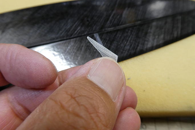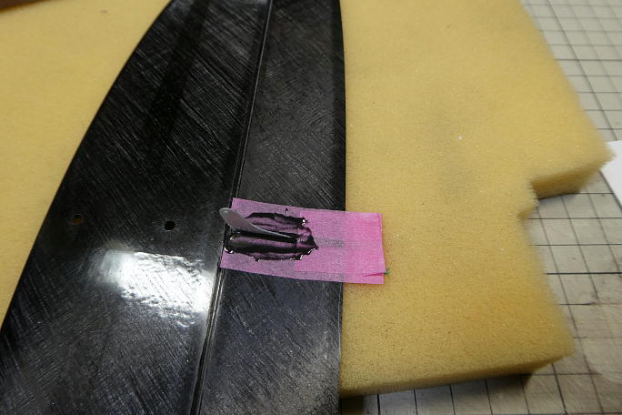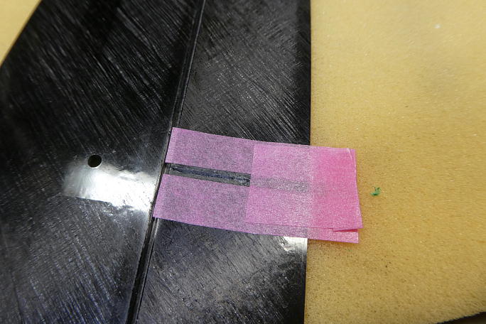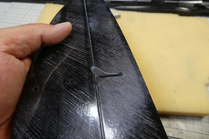 ![]() エレベーターホーンの取り付け工程もラダーホーン同様です。 表皮を超音波カッターで切り取っています。 ![]() エレベーターホーンの接着部をサンディングしておきます。 ![]() ホーン取り付け部の周囲をスロットより1ミリ離してマスキングして切れ込みの周囲をサンディングしておきます。 ![]() カーボンパウダー入り5分エポキシを切れ込みに充填、内壁に塗りつけてからエレベーターホーンを沈めます。 位置決めが終わったら、マスキングテープは直ぐ剥がしておきます。 ![]() エレへーターホーンの取り付けが完了です。 |