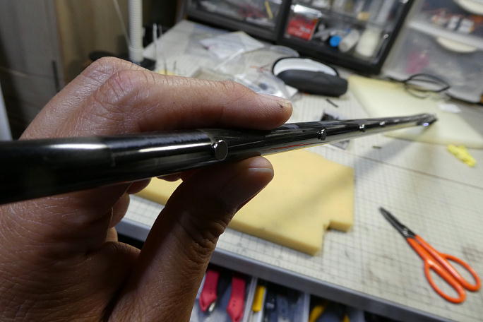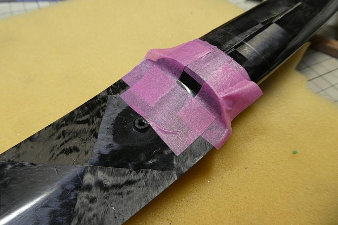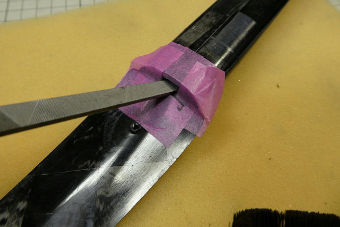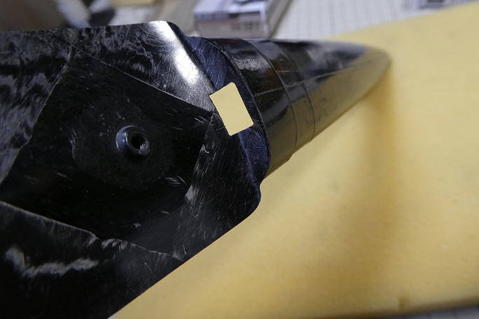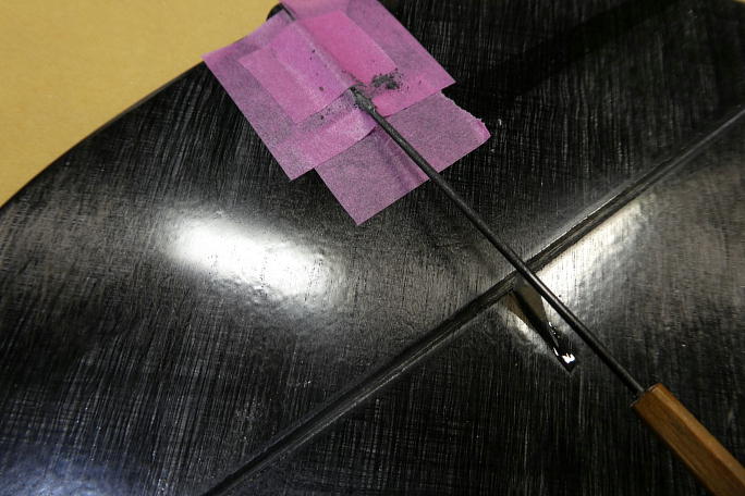 ![]() 垂直尾翼のブームポケット後端にリンケージ取り出し穴を加工します。 ![]() ロッド+チューブより少し大きめな1.5ミリに加工します。 リンケージの動作確認など色々と決まった後に カーボンパウダー入り5分エポキシを盛ります。 |