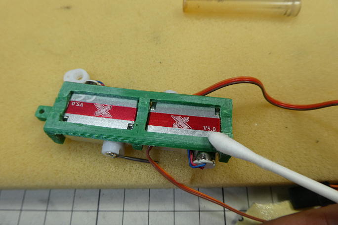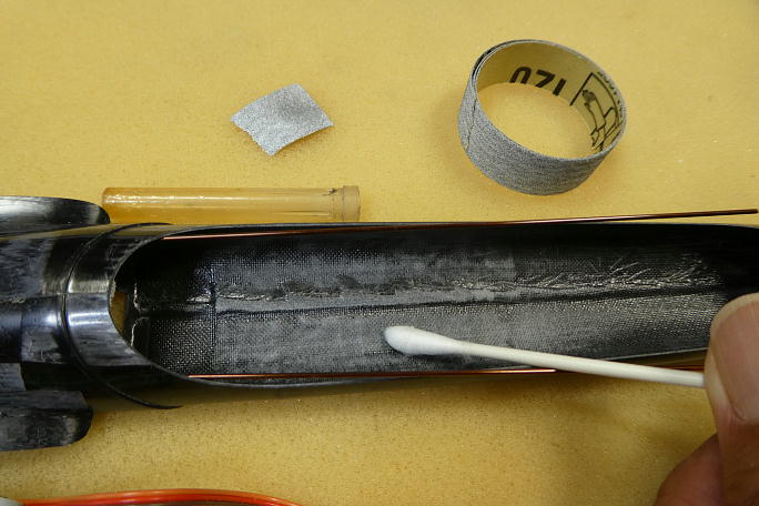 ![]() サーボベッドを取り付ける周辺の胴体内部をサンディングしておきます。 胴体製作時に出来たクロスの合わせ目が 出っ張って段差になっているので、平らになるようにサンディングします。 ![]() ![]() サーボベッドと胴体の接着部に硬化促進剤を塗っておきます。 ロックタイトの712を使用します。 ![]() 位置決めをしたら、中粘度瞬間接着剤を周囲に流してサーボベッドと胴体を接着します。 |